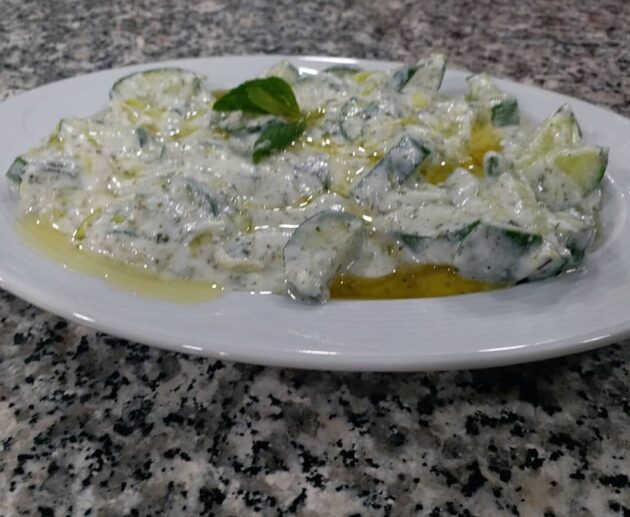İRAN CACIĞI TARİFİ Malzemeler 4 adet salatalık 400 gr süzme yoğurt 1 tutam taze nane 1 yemek kaşığı zeytin yağı 1 tatlı kaşığı tuz Yapılışı
