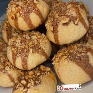 Hamurumuzdan ceviz büyüklüğünde parçalar koparalım ortasını açalım içerisine elmalı harçtan koyalım kapatalım daha sonra yumurta akına sonra fındığa batıralım fırın tepsisine dizelim önceden ısıtılmış 180 derece fırında 25 dakika pişirelim