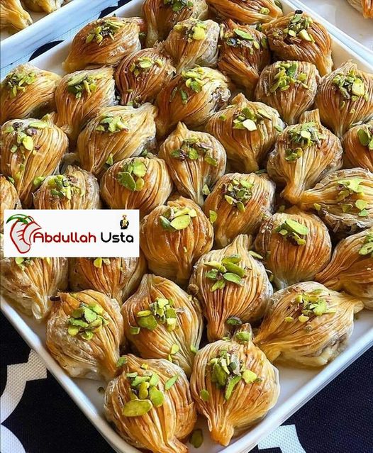 Tezgaha aldım yufkayı serbest bırakıyorum. Büzgülü bir şekilde çıkmış oldu. Üzerlerine fıstıkları yerleştiriyorum. Onunda üzerine hazırladığımız kaymağı koyuyorum. Şimdi üstünü örtüyorum. Sıkıştırarak ön şeklimizi belli ediyorum. Bıçak yardımıyla ortalarından kesiyorum. Tek tek alıyorum, ters çeviriyorum. Şeklimi kontrol ediyorum kenarlarını sıkıştırıyorum. Fazlalıkları da kesiyorum. Hepsini bu şekilde tamamladım ve tepsiye dizdim.
