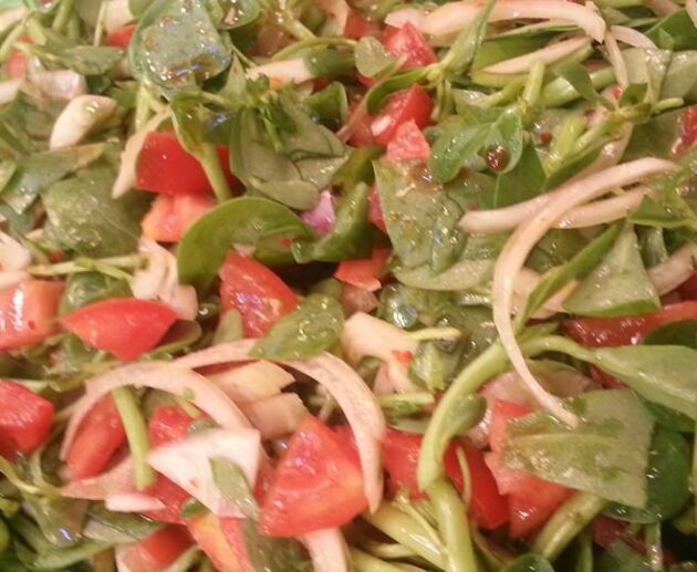 Tarif 1/2 demet semizotu 1/2 nanenin yaprakları 4-5 adet ince kıyılmış taze soğan 4 adet orta boy domates 2 adet orta boy salçalık kırmızı biber